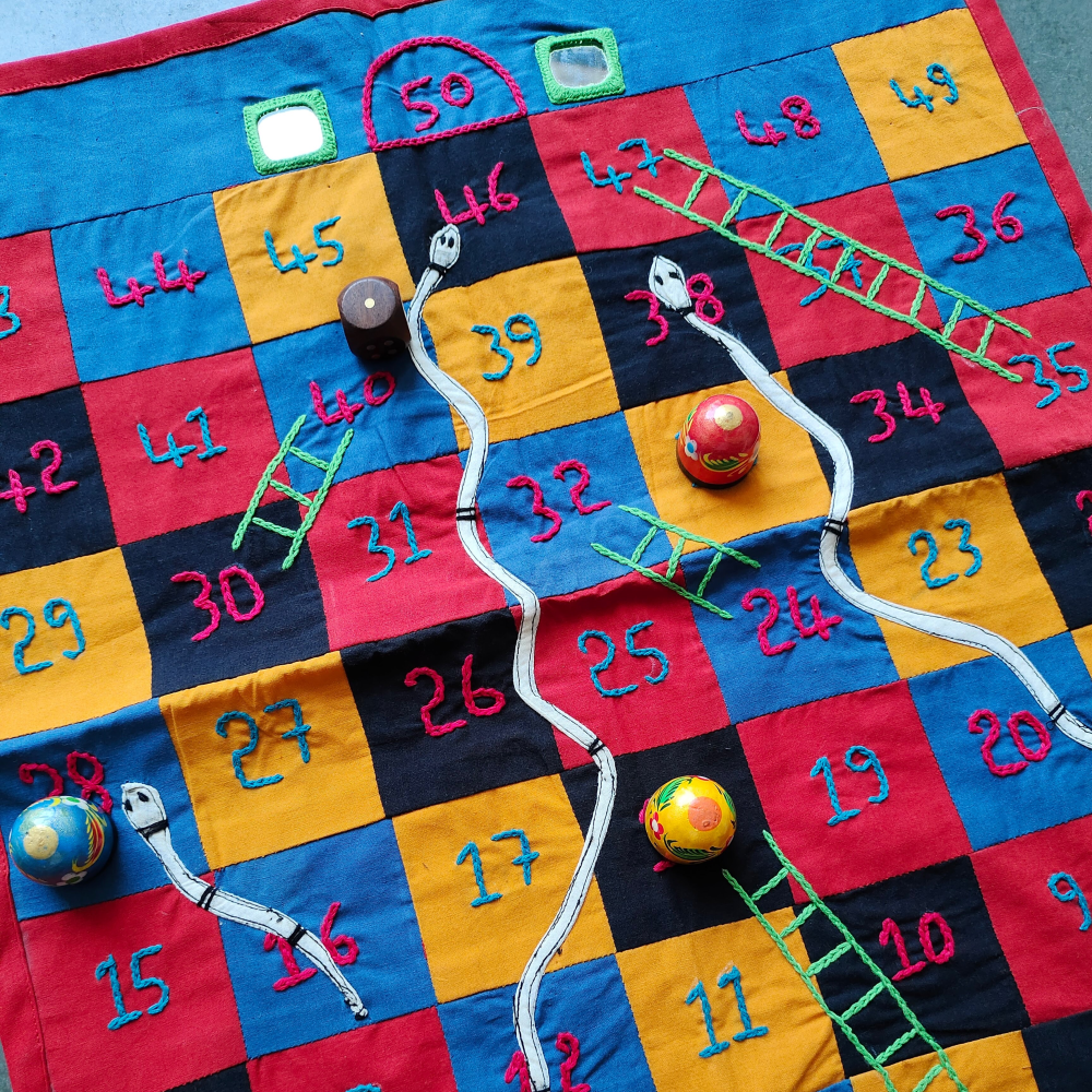 The household game of Snakes & ladders is brought to you in a smaller format, running upto 50 numbers. This has been designed for those who love this ancient game, and want a quicker format! This exquisite handloom gameboard has hand-embroidered numbers and comes with wooden pawns and dice. Please note that each set has its own unique design and colour combination. Game board size: 55cm x 55 cm #Haavuyeni #paramapada #sopanapatam #vaikunthapali