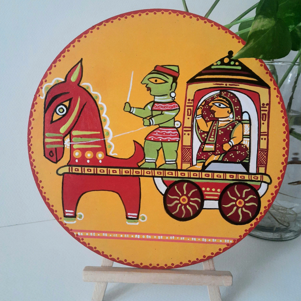 Table-top decorative mdf plates in 8" size: Bengali lady in horse-drawn carriage Bring the beauty of authentic and traditional Indian art forms into your home. This handpainted Jamini Roy plate will make any corner of your home lively and colourful. Size:8 inch round Materials used: mdf board, acrylic colours Size: 8" round Type: Table-top decor item Stand included • Colourful and vibrant • Handpainted, handmade • Traditional Indian painting • Varnished , easy to clean • 7" mini easel (wooden stand ) provided for ease of display • Dispatch time: 8 days