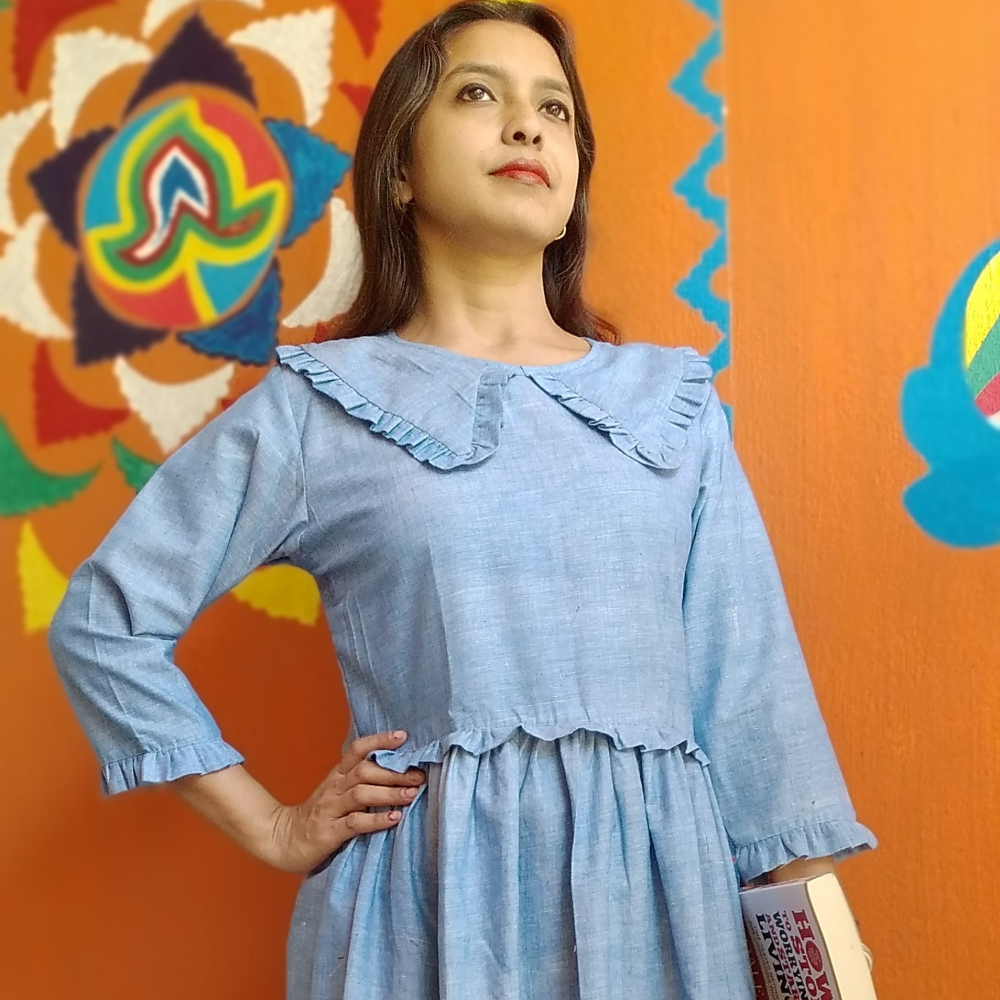 “This blue button down dress has a shirt collar, long sleeves, patch pocket and tie-up detail. Made from Handwoven Premium 22s Double Twisted Cotton Fabrics, it is soft and comfortable to wear specially during the hot humid Summer .Comes with a frills at waist is Non-transparent and has pockets.Easy to Care and being breathable, is Ideal for traveling too. Fabric : Handwoven Premium 22 S DT cotton. Size : M Collar : Frilled Collar. Sleeves : Three Quarter Frilled Sleeves. Color : Washed Blue Length 43 inches. SHIPPING & RETURN Shipping time for this product is 1- 3 days. Dispatch can take up to a week in case of product made on order. I’m not a Returnable nor an Exchangeable product because I am a perfect fit for you. WASH CARE All our clothes require love & care wash separately in cold water. Do not soak or scrub hard with brush. Use mild detergents like baby shampoo. Do not wash with bleach or chlorine. Dry in shade or diffused light. Handwoven COTTON fabrics have an inherent nature of slubs. Do not try and remove them.