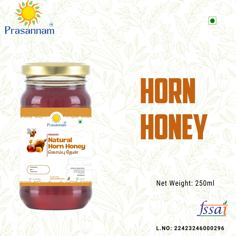 Prasannam Natural Horn Honey is special, pure honey. It comes from clean, natural environments and is harvested traditionally. This honey is raw and unfiltered, keeping all its natural goodness. Key Features: Raw and Unfiltered: It keeps all the natural nutrients and flavors. Unique Horn Harvesting: Stored in natural horn containers, which helps preserve its unique taste. Rich Flavor: Offers a blend of floral, fruity, and earthy flavors. Each jar has its own unique taste. Health Benefits: Full of antioxidants, vitamins, and minerals. It may help boost your health. Sustainable: Harvested with care to protect the bees and their environment. Enjoy this honey on toast, in tea, or as a natural sweetener. Its pure, rich taste makes it a great addition to your diet.