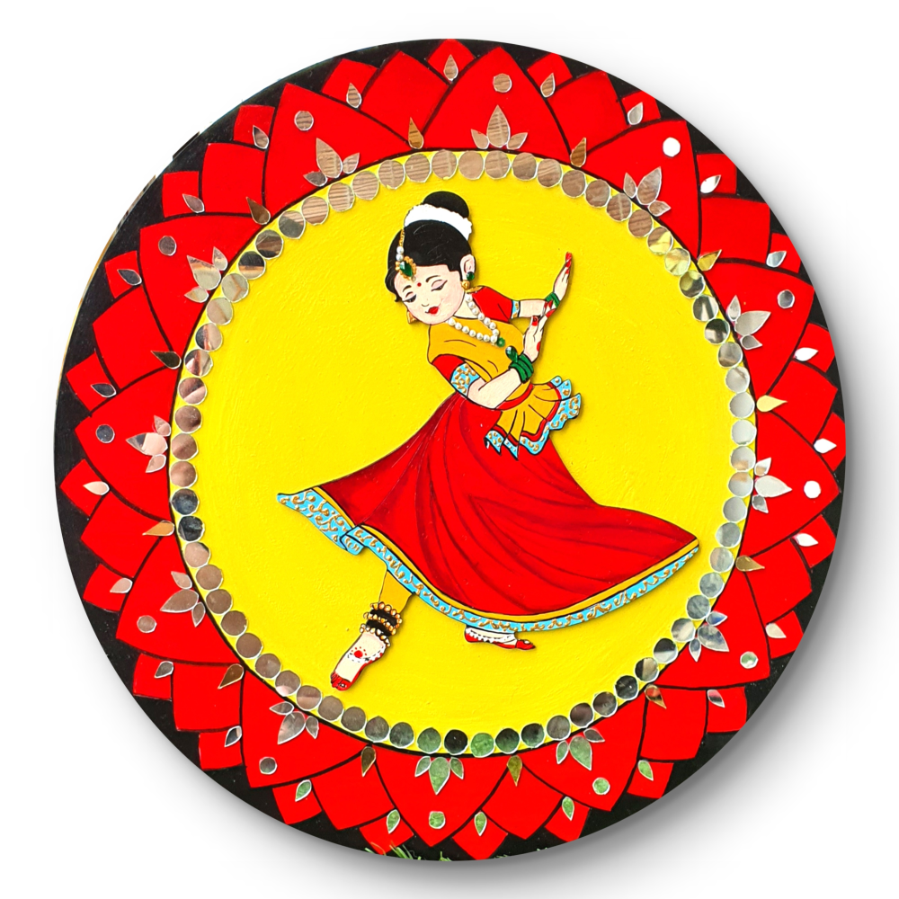This artwork is based on the Indian dance mudra . The color technique is fresh and bright. Hang it in a wall in your home or gift it to a Indian Classical dancer! Size -Length 14"x Width 14" Color- Material - Mdf Board , Acrylic Colors, Stones and Mirrors Care and Handling - "Each product is carefully handcrafted and hand painted. The handcrafted product may have some imperfections. Please treat minor imperfections as part of the art form. To clean, wipe with a dry cloth. Avoid direct contact with water."